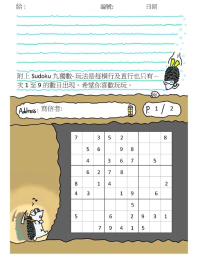 附上數款印有圖案的信紙作為參考,信紙的醒目圖案可逗收信人一笑,數獨迷陣讓他們消磨時間,大家可自行印制使用或於坊間購買類似紙張。使用普通紙或單行紙(白色或其他顏色)亦可以。
